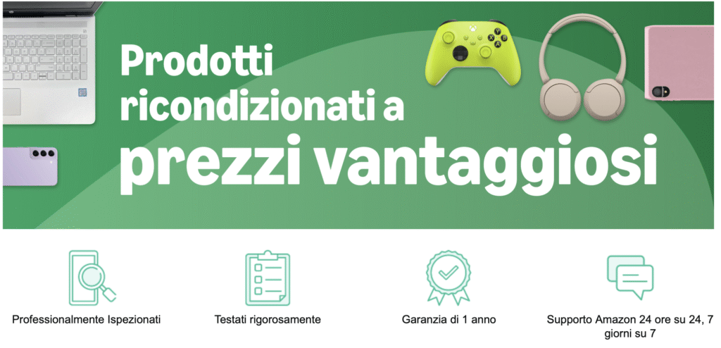 Il mondo Renewed è l’opposto di Haul: strutturato, professionale, rigoroso. La pagina è raggiungibile tramite Ricondizionato certificato, dove Amazon descrive il programma come “la destinazione affidabile per prodotti ricondizionati, usati o con confezione aperta”. Tutti gli articoli vengono testati da venditori qualificati secondo criteri tecnici documentati: condizioni estetiche, funzionalità, stato della batteria, integrità dei componenti, pulizia e imballaggio.