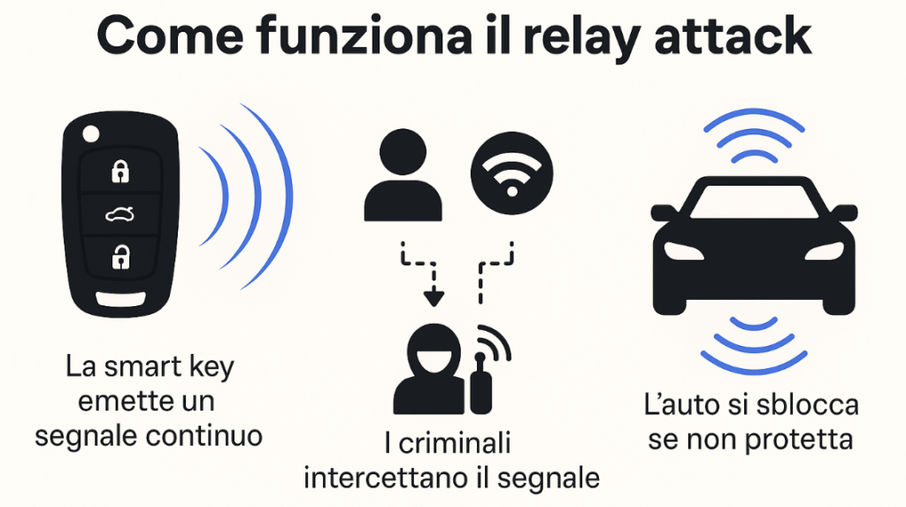 Le chiavi moderne (smart key) non si spengono mai. Continuano a emettere un piccolo segnale RFID che comunica all’auto la loro presenza. I ladri sfruttano questo segnale con un relay attack, un dispositivo che cattura l’onda radio vicino alla tua casa, la amplifica e la trasmette fino alla macchina parcheggiata.