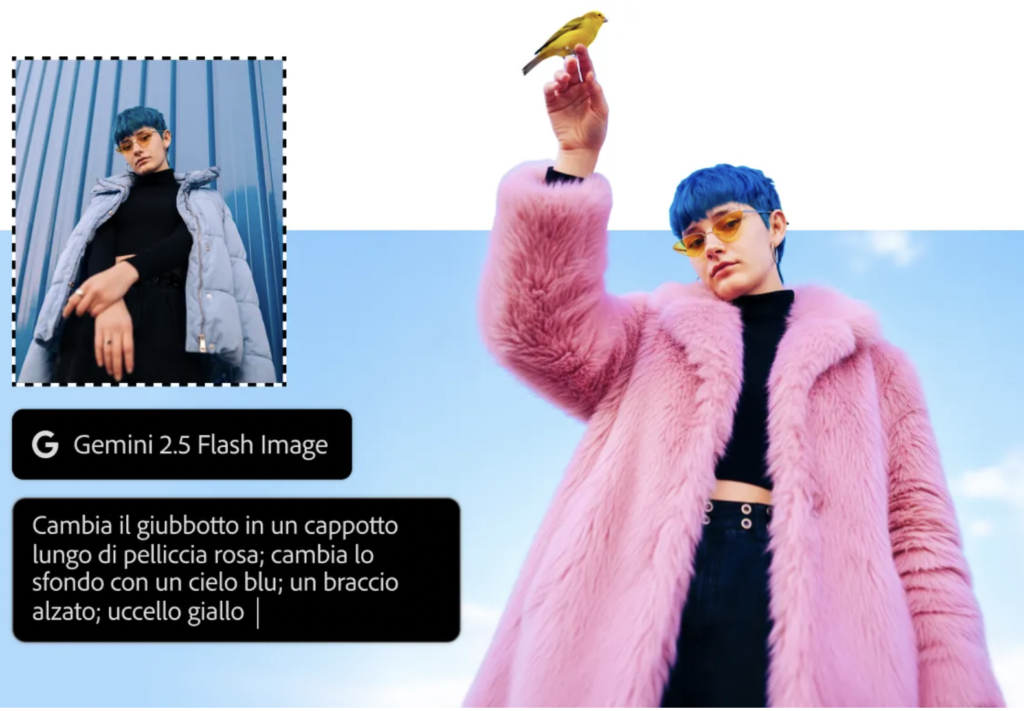 All’interno di Photoshop è possibile scegliere modelli diversi, come Gemini 2.5 di Google o Flux Kontext Pro, ciascuno con un comportamento leggermente diverso: alcuni più fedeli al realismo, altri più creativi nell’interpretazione.