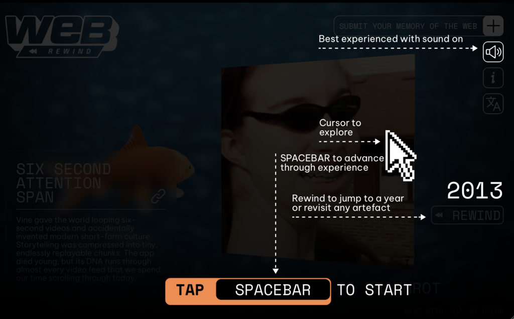 Web Rewind raccoglie 31 artefatti interattivi, ciascuno legato a un anno specifico della storia di internet. L’esperienza è pensata per essere completamente coinvolgente: tenendo premuta la barra spaziatrice si naviga tra le diverse epoche, mentre le frecce direzionali permettono di esplorare i contenuti di ogni sezione. Una narrazione audio accompagna il visitatore come una guida museale, spiegando il contesto storico di ogni elemento.